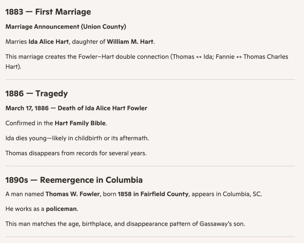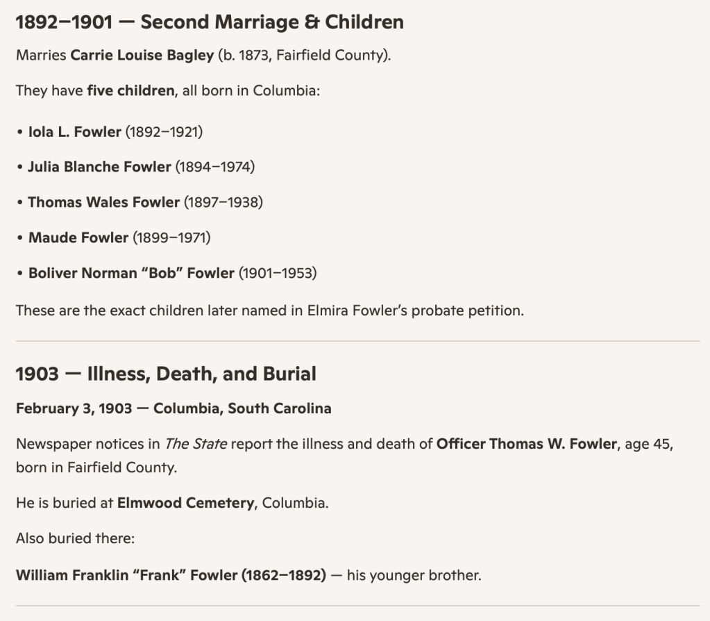 This article lays out the documented facts—census records, marriage records, probate filings, and burial locations—that prove beyond question that Thomas William Fowler, son of Gazaway Fowler and Elmira Smith married twice, had five children, was a respected policeman in Columbia, died in 1903, and was buried at Elmwood Cemetery in Columbia.