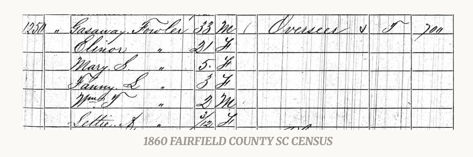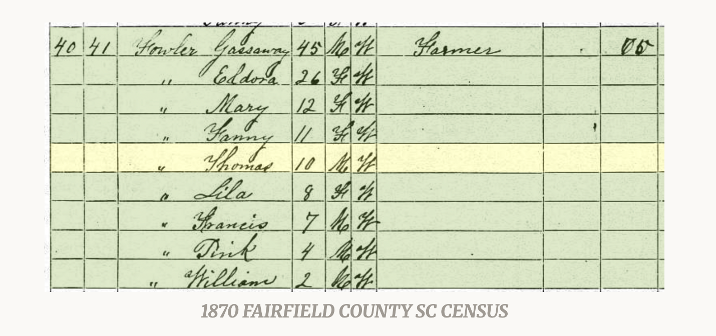 Gazaway and Elmira Fowler had a son named Thomas Fowler, born circa 1858 in Fairfield County.
