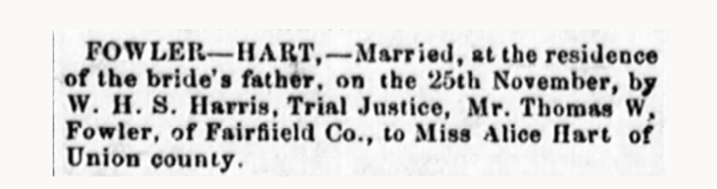 Frances L. “Fannie” Fowler — daughter of Gazaway Fowler — married Thomas Charles Hart, son of William M. Hart.