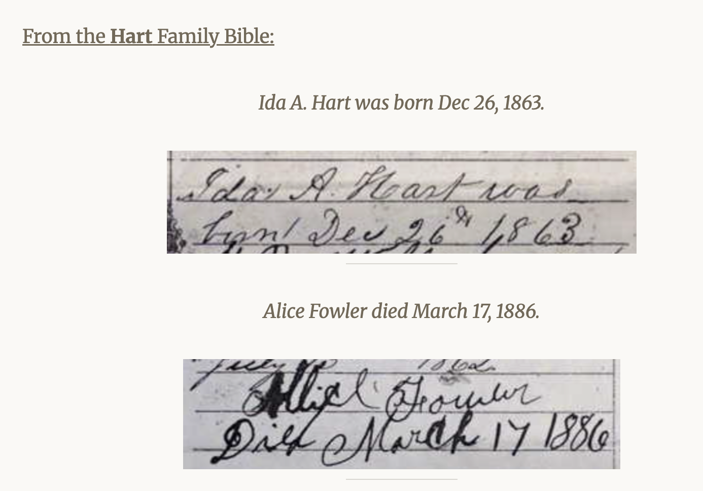 Ida Allice Hart was born December 26, 1863, married Thomas William Fowler in 1883, and died March 17, 1886.
