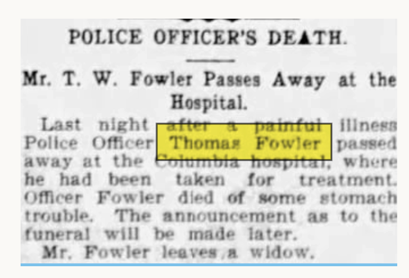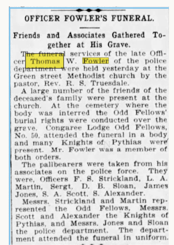 Thomas W. Fowler was a policeman in Columbia SC. His illness and subsequent death were announced in The State newspaper in 1903.