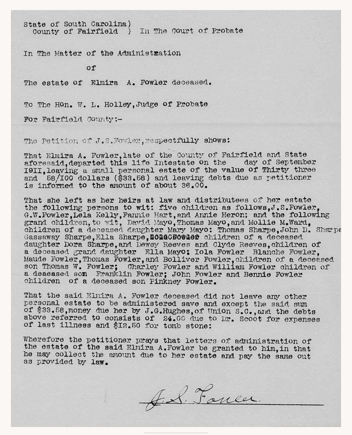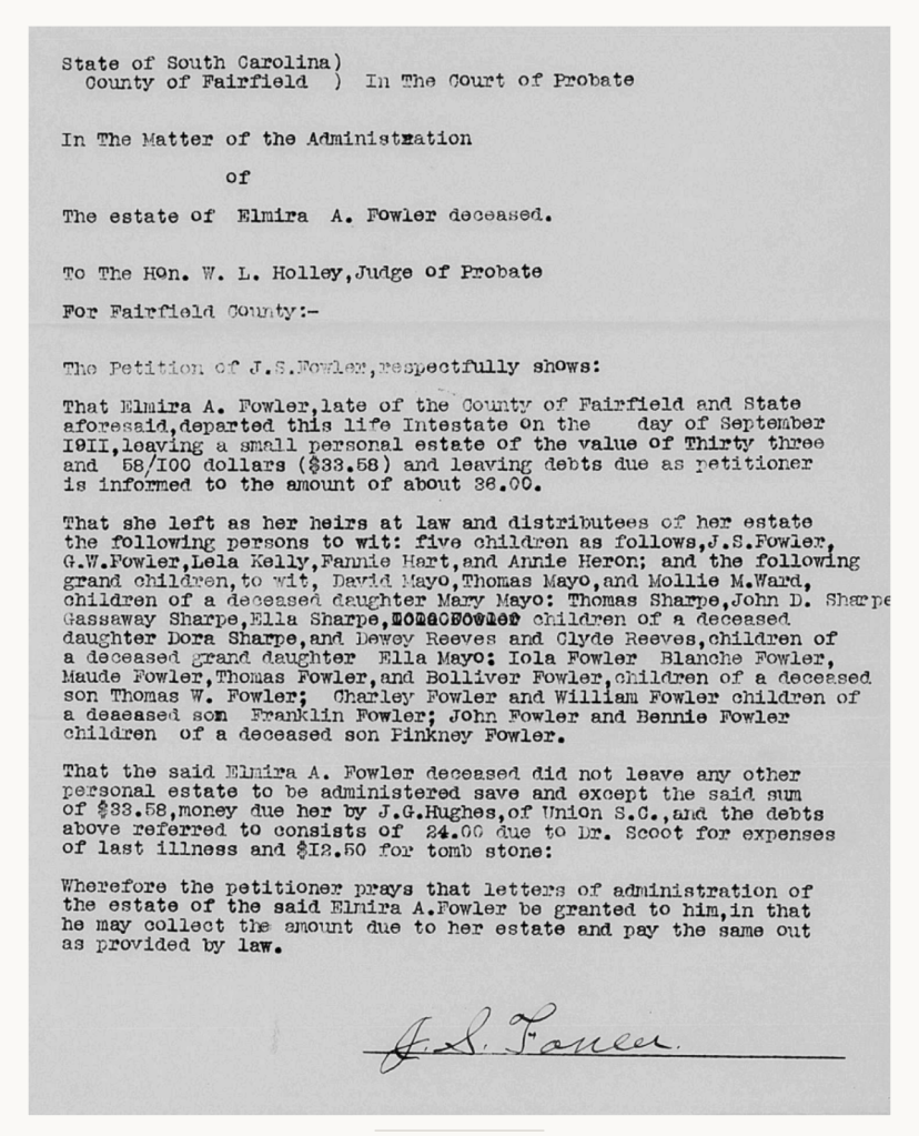 The probate petition below concerns the estate of Elmira A. Fowler of Fairfield County, South Carolina, who died intestate in September in 1911. She left a modest estate and several adult children and grandchildren as heirs.